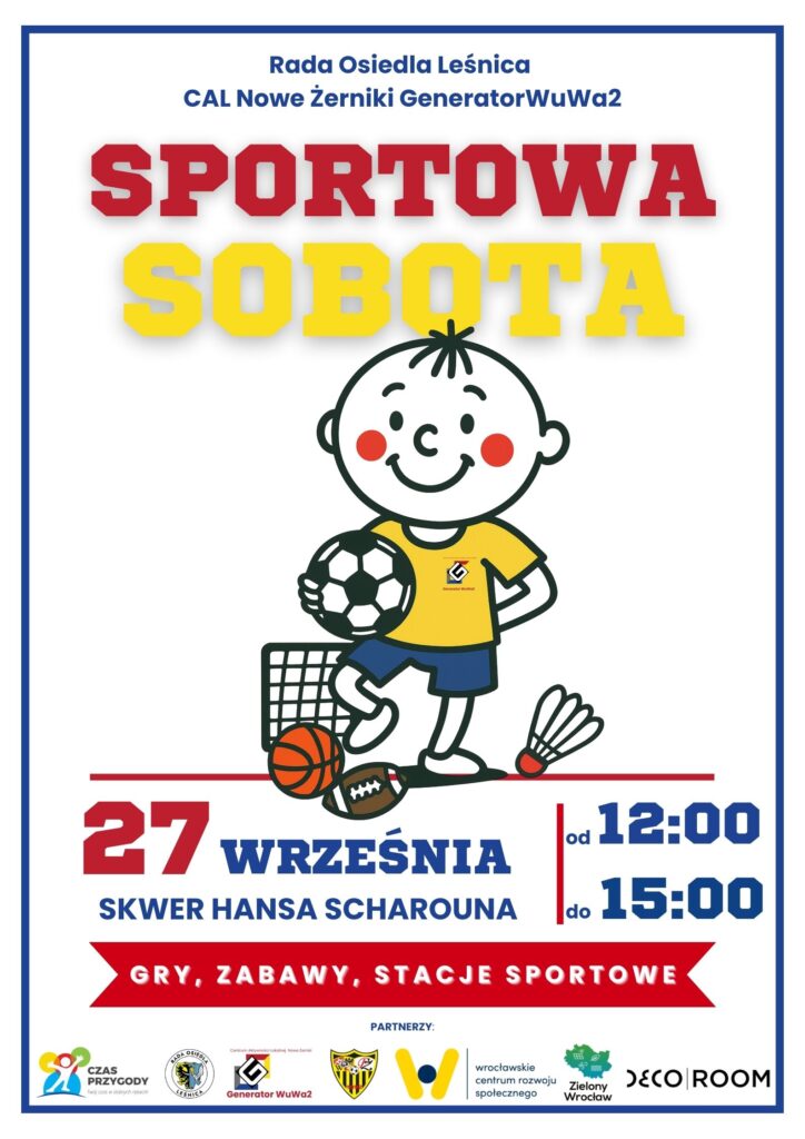 W najbliższą sobotę od 12.00 do 15.00 zapraszamy na imprezę sportową dla dzieci – Sportowa Sobota na Nowych Żernikach, teren rekreacyjny i boisko na Skwerze Scharouna. Mamy nadzieję, że w zabawach wezmą udział całe rodziny, wszyscy będą się dobrze bawić, a wydarzenie przyczyni się do budowania dobrych relacji sąsiedzkich.